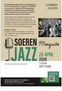 Op zondagmiddag 26 April verzorgt Mosquito een concert in het Sprengenhuis in Laag Soeren. Het concert is een eerbetoon aan Art Blakey & The Jazz Messengers. Mosquito laat zich nog steeds inspireren door de “Hardbop” die door deze legendarische drummer bekend werd maar heeft er wel een eigen draai aangegeven.